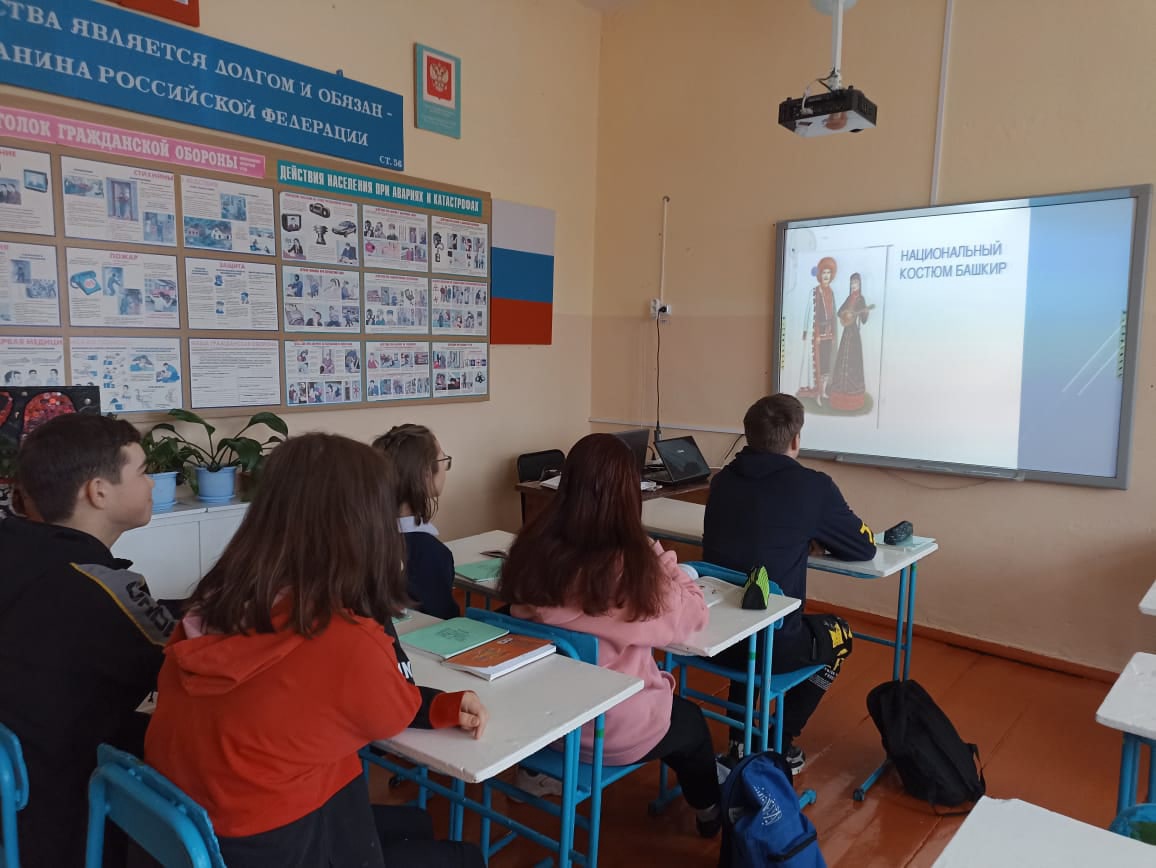 Мы живём в многонациональном крае под названием Республики Башкортостан.С незапамятных времён здесь бок о бок жили представители самых разных национальностей.У каждой национальности есть свои исторические и культурные особенности.Национальный костюм - неотьемлемая часть культуры любого народа.Семенова И.М. провела 8кл классный час "Национальный костюм башкир".Обучающиеся ознакомились башкирским национальным костюмом :елян, тюбетейка, кашмау.